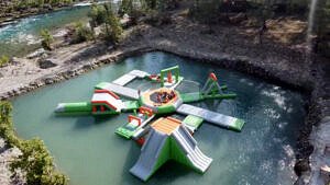 Entertainment at the base: inflatable water park, fishing, zipline.